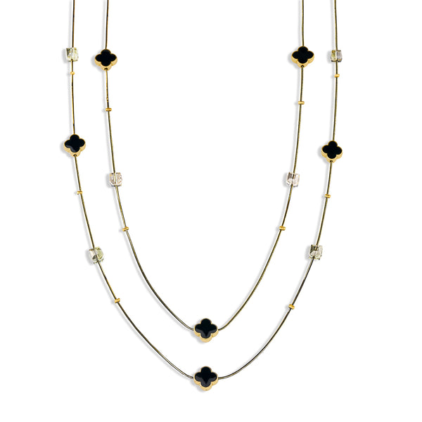 Pera Jewelry Flower Long Station Chain Layer Black Enamel Clover Necklace, Four Leaf Clover Necklace for Women, Four Leaf Layered Station Necklaces
